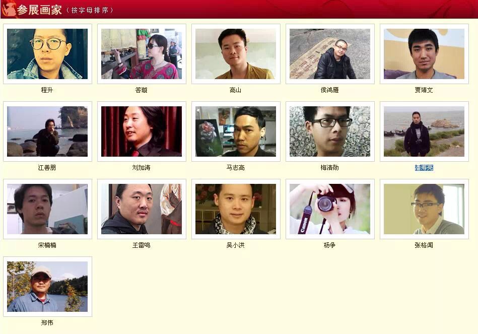 此次展览的画家为:程升、答璇、高山、侯鸿雁、贾靖文、江善朋、刘加涛、马志高、梅清勋、潘寿亮、宋楠楠、王雷鸣、吴小洪、杨争、张格闻、郑伟(按首字母排序)